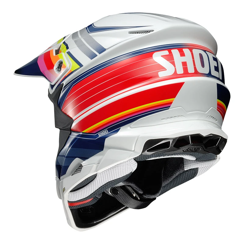 Lo SHOEI VFX-WR sarà disponibile in 6 taglie (XS-XXL), prodotte su 4 misure di calotte esterna differenti realizzate in mescola di fibre SHOEI AIM+. Naturalmente le caratteristiche di serie sono di alto livello, tanto quanto ci si aspetta da ogni calotte SHOEI – il sistema di ventilazione è composto da 16 ingressi ed estrattori d’aria per mantenere fresca la temperatura interna alla calotta, il confort ottimale è garantito dagli interni realizzati in 3D Max-Dry interamente removibili e lavabili. Anche questo modello è equipaggiato con il ben noto sistema di sgancio di emergenza dei guanciali Emergency Quick Release System (E.Q.R.S.) e una ampia finestra di visual per una maggiore visibilità periferica e per posizionare tutti i tipi di maschere sul mercato. Il VFX-WR è la scelta perfetta per tutti i motociclisti del fuori strada.